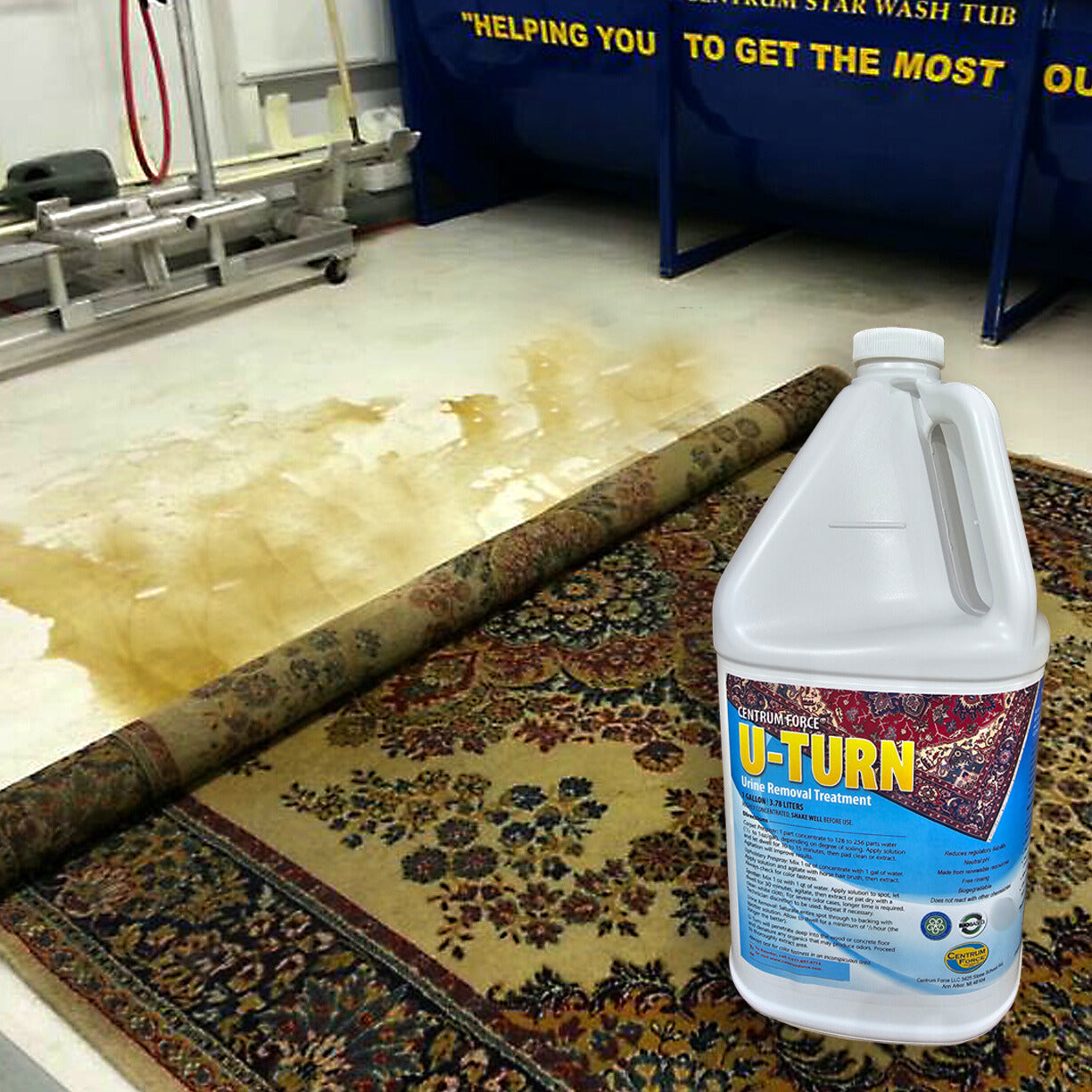 Every rug pro knows that everything about urine contamination stinks with the exception of the big profits and customer kudos that an effective urine removal method can bring your shop. That’s why you should join the hundreds of satisfied rug washers across the U.S.A. who have made U-Turn their primary tool for urine removal. It’s a totally natural and non-toxic product that puts a very powerful and concentrated form of our colloidal micelle technology to work on this problem. U-Turn breaks down urine molecules enabling them to be completely flushed out without any residue.
